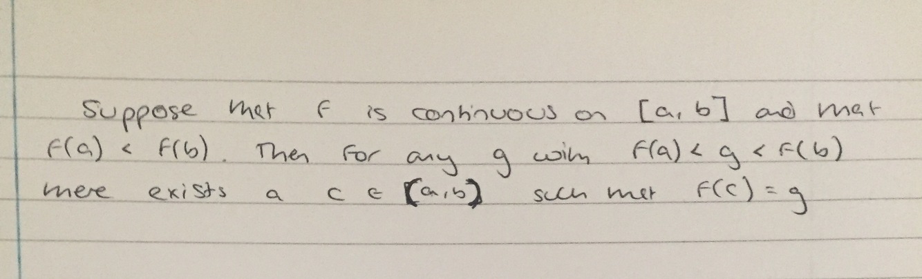 If f: [a,b] to R is continuous then f is bounded above and below on [a,b]. There exists a x* and an y* in [a,b] such that f(x*) = inf(f(x)) and f(y*)=sup(f(x))