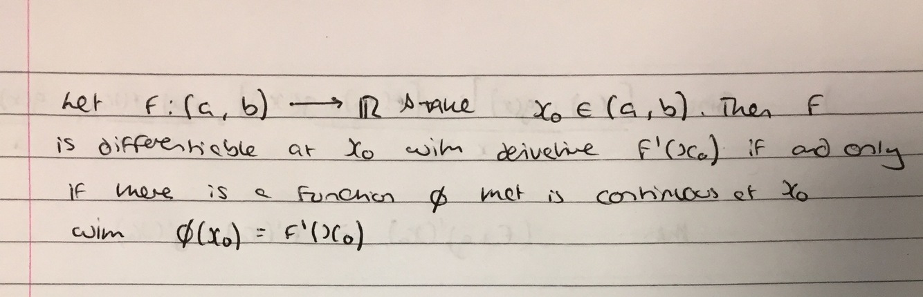 Give the two limits that must exist for a function f:(a,b) to R to be differentiable at x0 in (a,b)