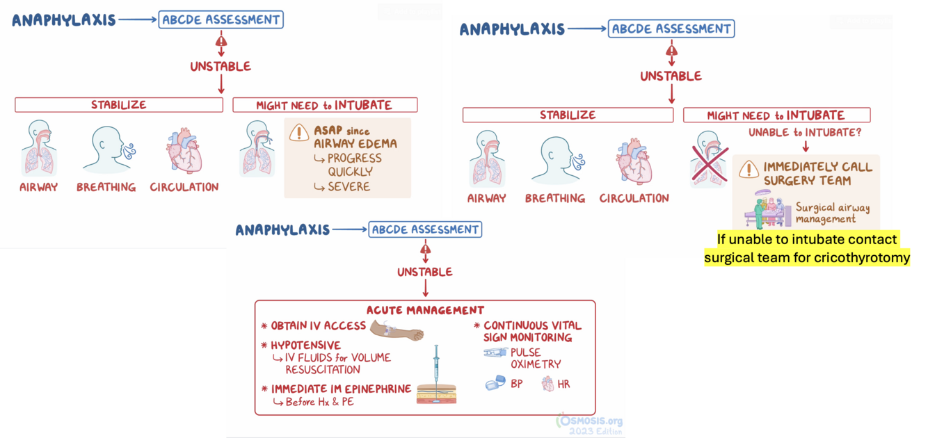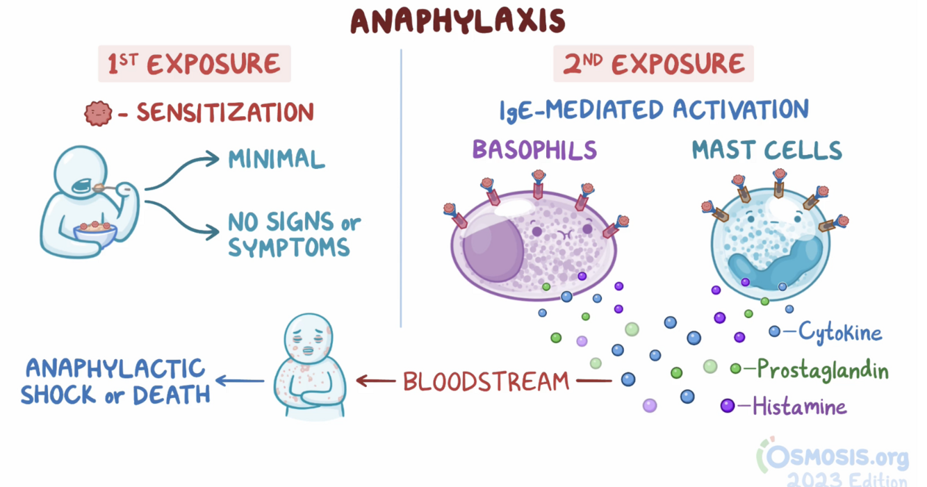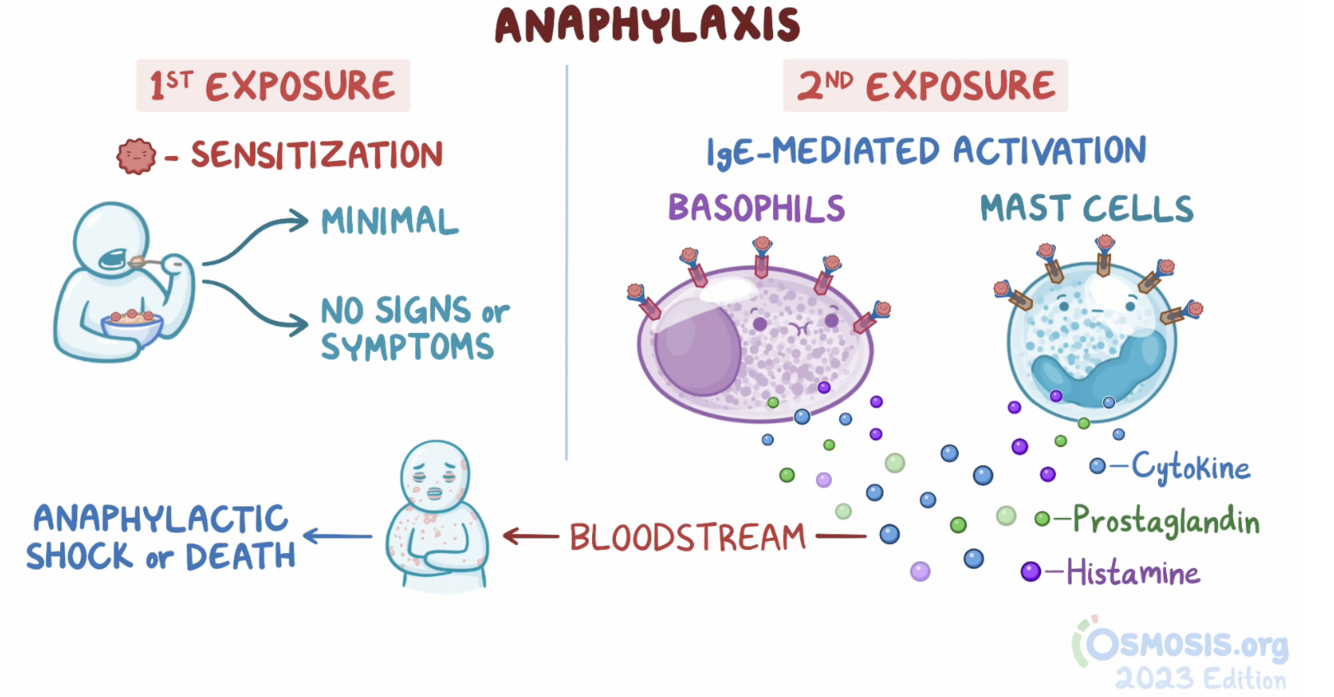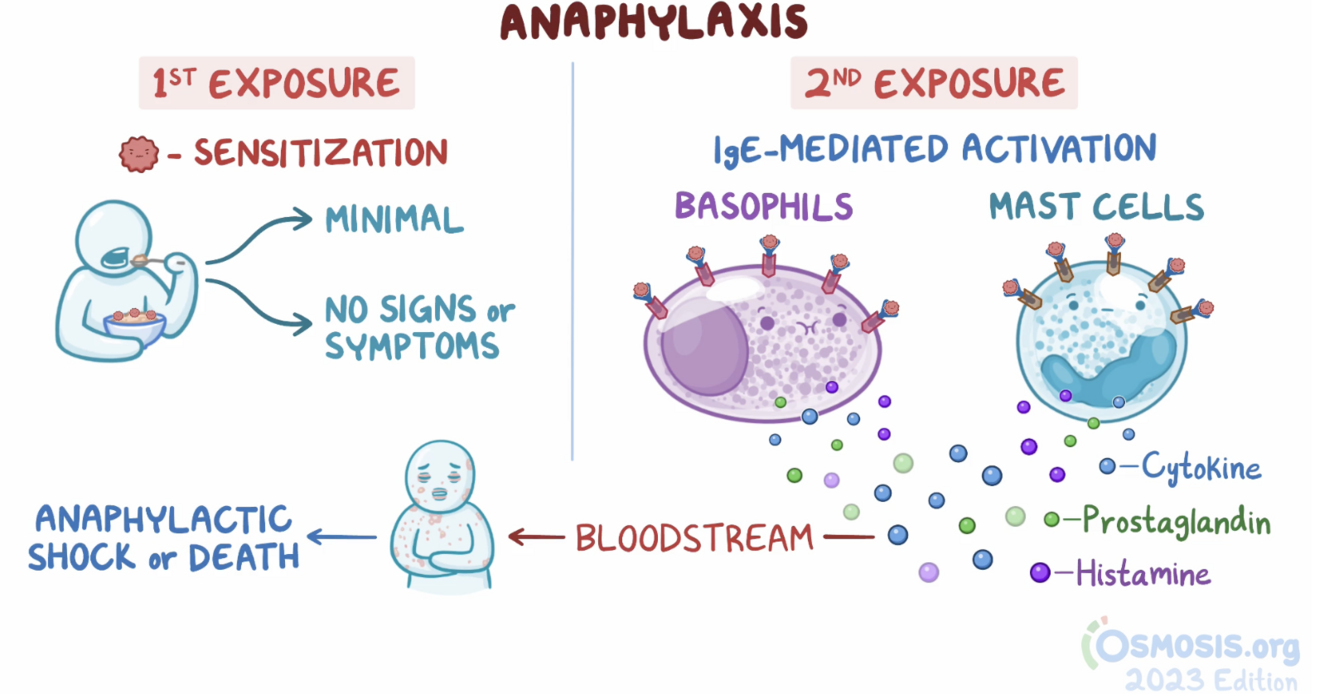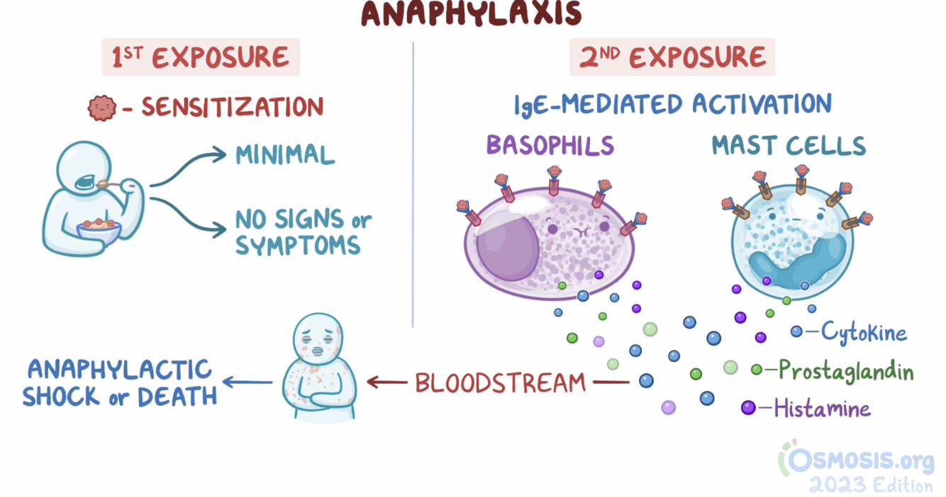 Anaphylaxis is an immediate severe allergic reaction following sequential exposure, leading to an immune (IgE) mediated mast cell and basophil degranulation. In general, it is defined by the severity of symptoms, not cause.