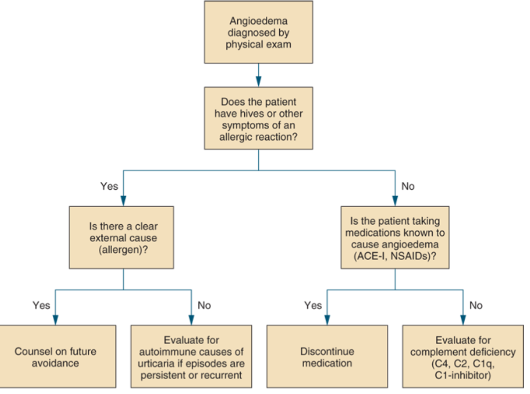 What further questions to ask/answer when we diagnose laryngeal angioedema in a physical exam?