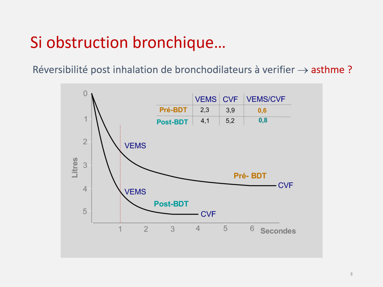 V ou F Le diagnostique d’asthme avec la spirométrie est donné lorsque le rapport VEMS/CVF pré-BDT est plus grand que le rapport VEMS/CVF post-BDT