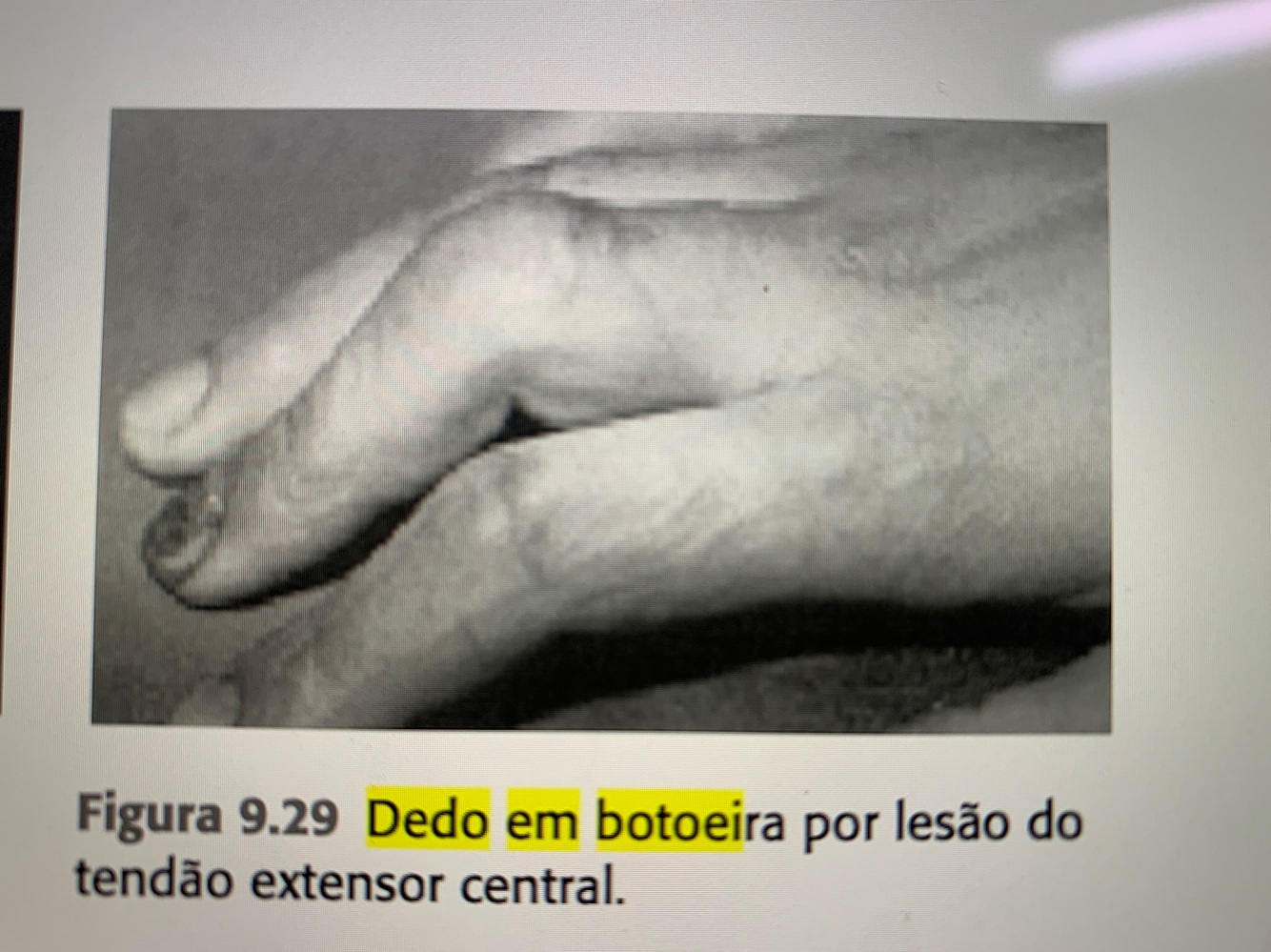 Lesão do extensor terminal na inserção (Falange distal) - Flexão da IFD - pode ocorrer por lesão tendinea ou fratura avulsao