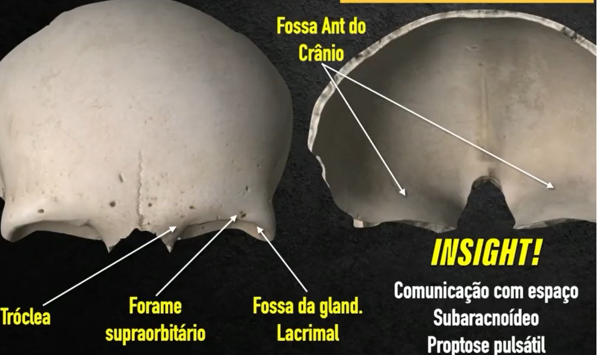 A fossa troclear localiza-se no osso frontal, lateralmente ao forame supraorbital.