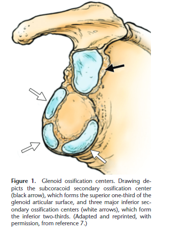 Mais tardiamente, surgem 3 centros de ossificação infraglenoidais → ⅔ inferiores da glenóide