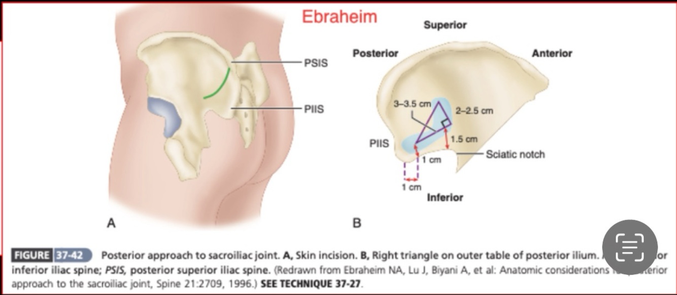 Acesso para sacroilíaca; acesso transósseo sem muita dissecção; incisão EIPS até médio entre EIPS-EIPl e estender 5cm lateral e distal; abrir triângulo ósseo com osteótomo e remover cartilagem sacro e íleo