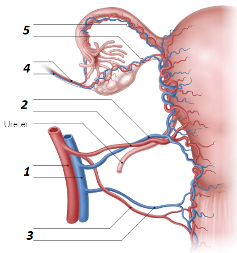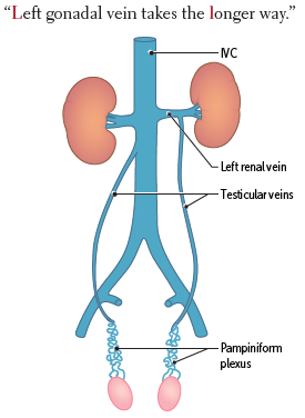 El ovario/testículo izquierdo drena a través de la vena gonadal izquierda y la vena renal izquierda hacia la vena cava inferior; el ovario/testículo derecho drena directamente de la vena gonadal derecha a la vena cava inferior.