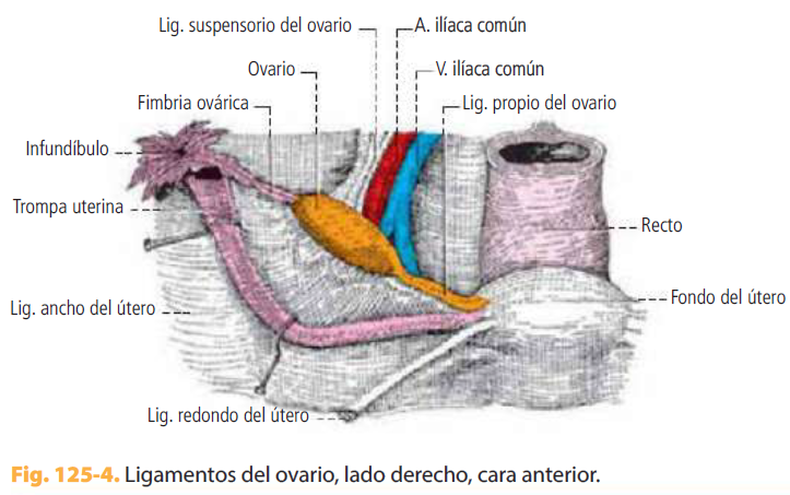 El ligamento redondo del útero, las trompas de Falopio y los ovarios