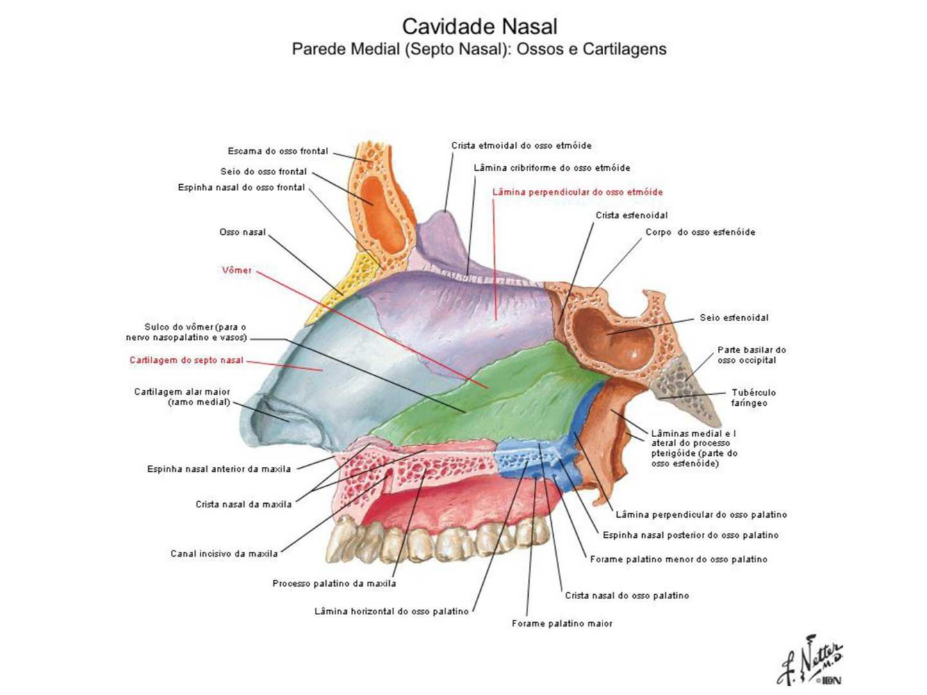 Vomer: porções superior, posterior, inferior (triangulo de base posterior); se articula com a crista maxilar