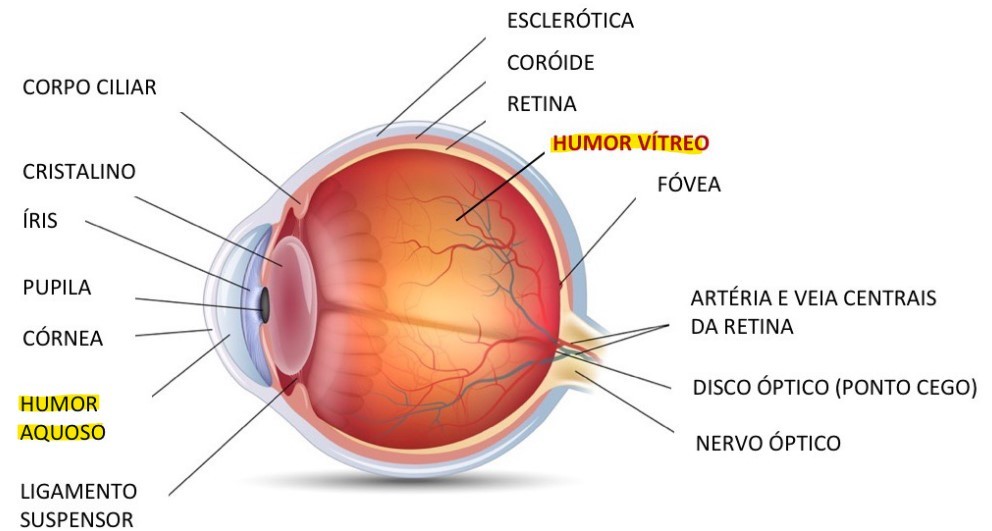 O humor vítreo é composto por 99% água e 1% de colágeno e ácido hialurônico