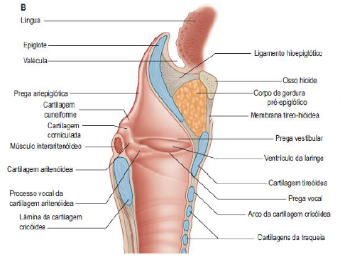 Maior parte dos tecidos da laringe, da epiglote até o nível das pregas vocais, incluindo a maior parte da musculatura laríngea.