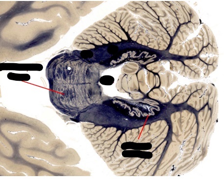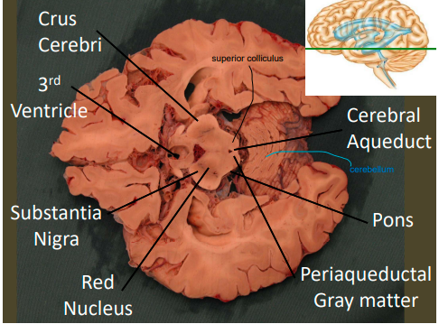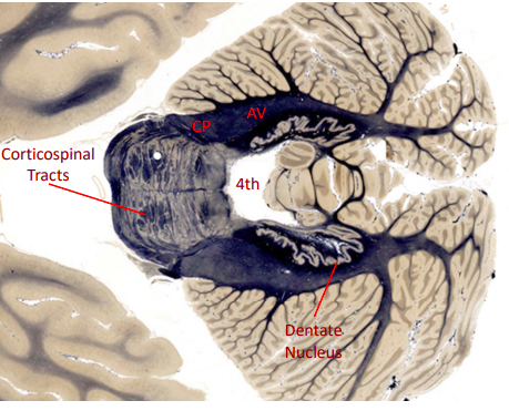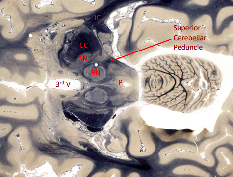 superior cerebellar peduncle - connects to the red nuclei of tegmnetum (deepest portion)