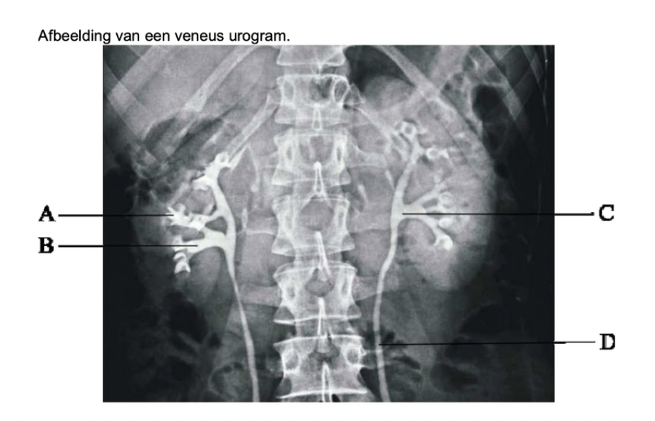 De ureter verloopt dorsaal ten opzichte van de v. testicularis/ovarica en dorsaal ten opzichte van de v. iliaca communis