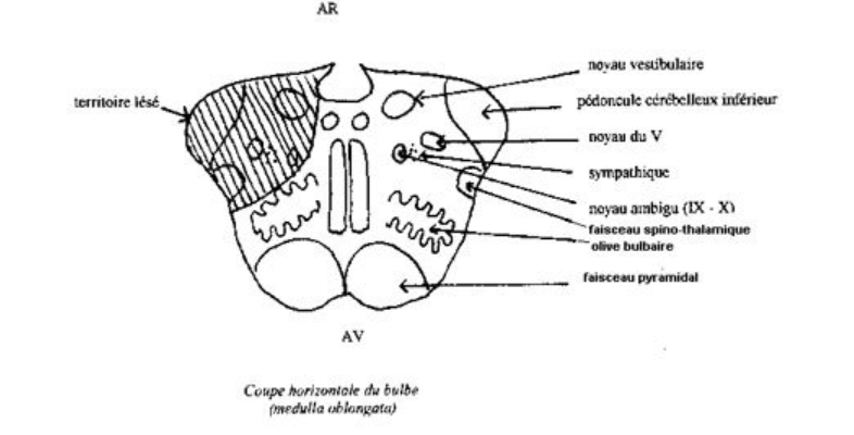 C’est un syndrome alterne, bulbaire, résultant d’une lésion du territoire rétro-olivaire. Le plus souvent, il est du à l’occlusion de l’artère de la fossette latérale du bulbe, branche de l’artère cérébelleuse postéro-inférieure, elle-même branche de l’artère vertébrale.