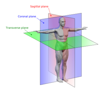 Plan sagittal: tout plan vertical divisant le corps en deux parties : droite et gauche. Le plan sagittal passant par le centre du corps et le divisant en deux parties égales droite et gauche est appelé : plan sagittal médian.