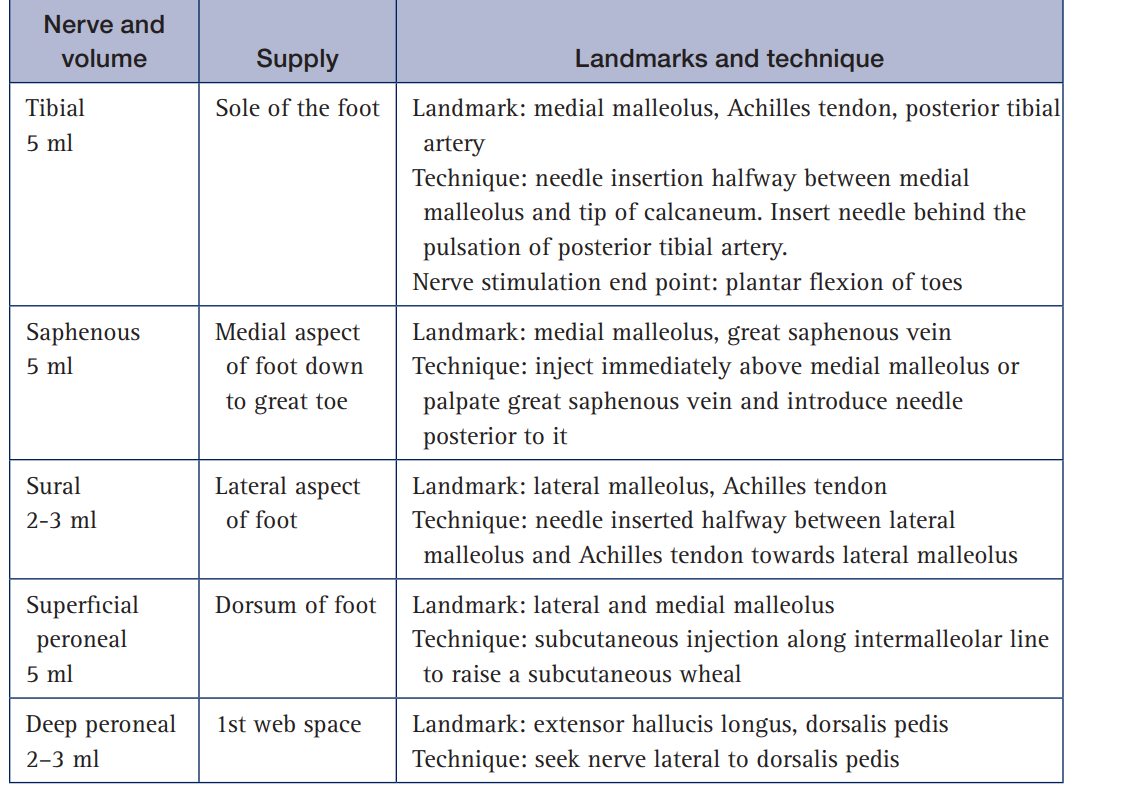 Sciatic nerve origin lumbosacral plexus L4-S3 Travels down the posterior thigh Divides in common peroneal and tibial nerves ~6cm above popliteal crease (but variable 5-18cm) CPN and TN contained within common fascial sheath Nerves are superficial and lateral to PA and PV TN usually lies more medially and closer to vessels Aim to find the point where sciatic divides - so as not to miss one nerve Usually shallow ~2cm deep Using Ultrasound and in plane technique can follow needle from skin so unlikely to cause vascular injury Advantages Excellent analgesia Up to 16hrs with adjuncts Can do case just with block eg debridement suitable for catheter technique Disadvantage May not cover both nerves Saphenous coverage still needed for complete analgesia (consider max doses) Avoid adrenaline containing solutions - poor blood supply