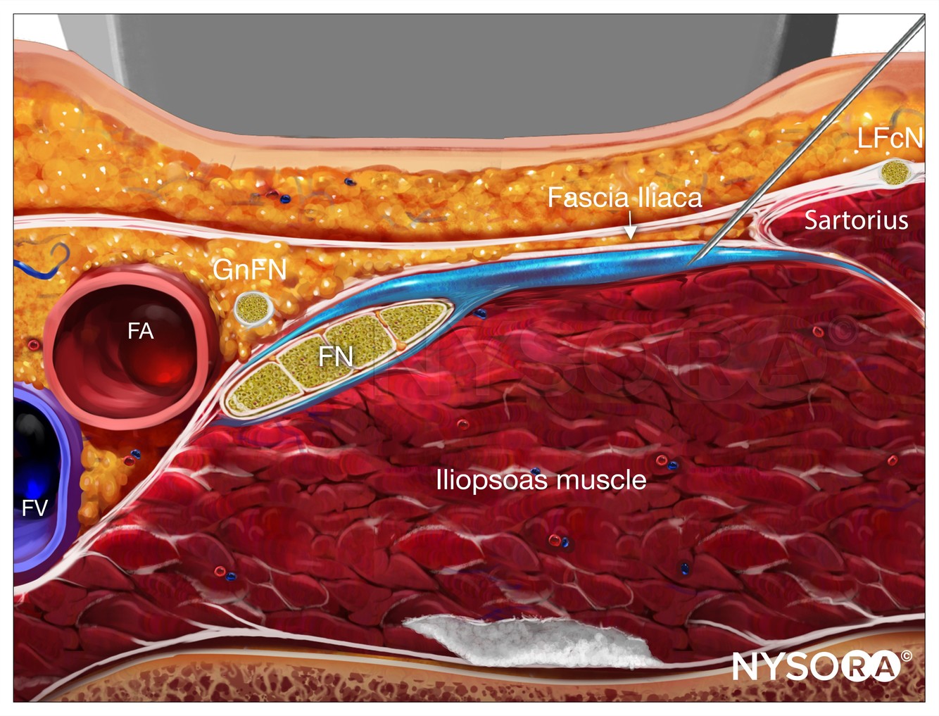 Surface anatomy = femoral crease , identify FA , FV, FN and fascia iliaca
