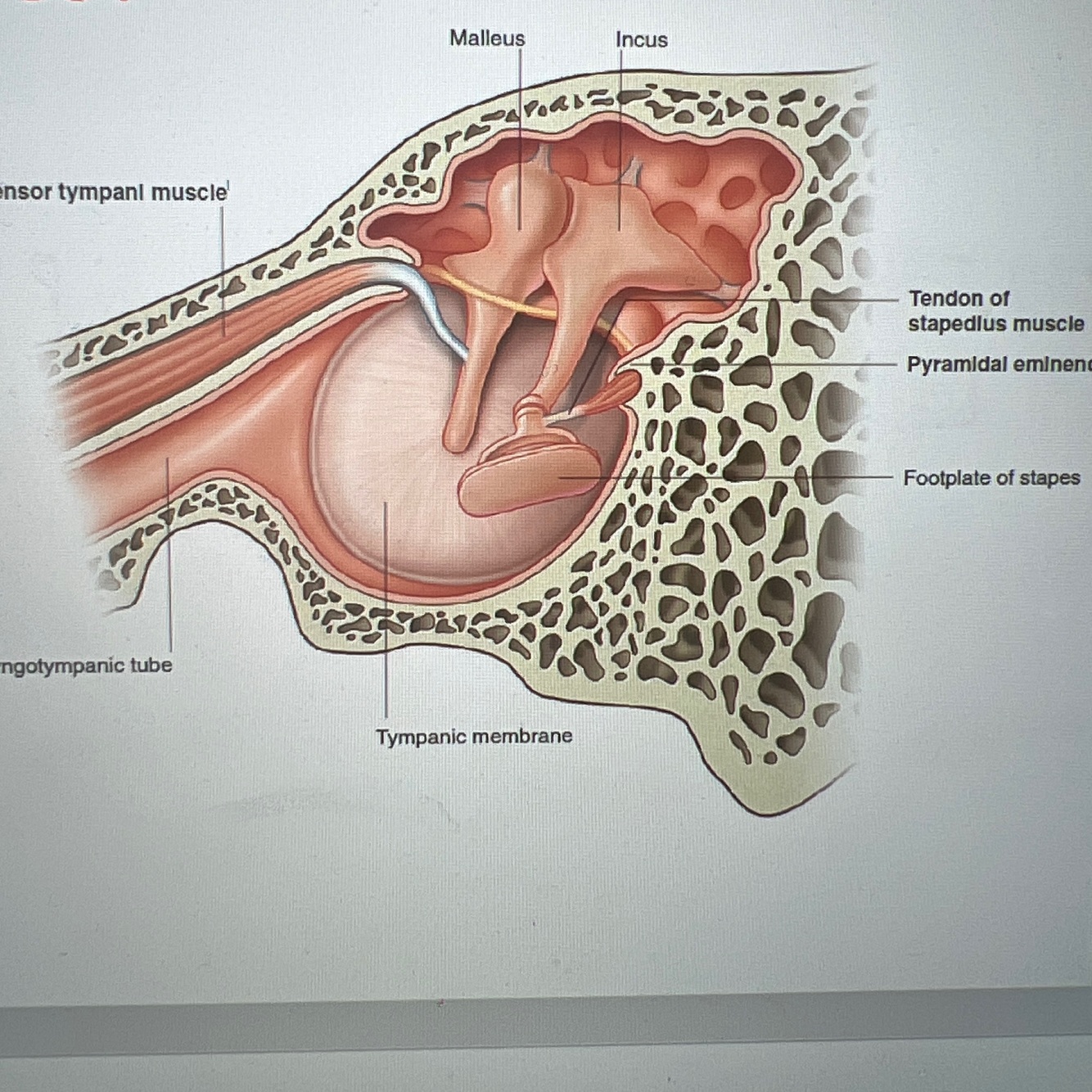 - Tensor tympani (attached to the malleus)