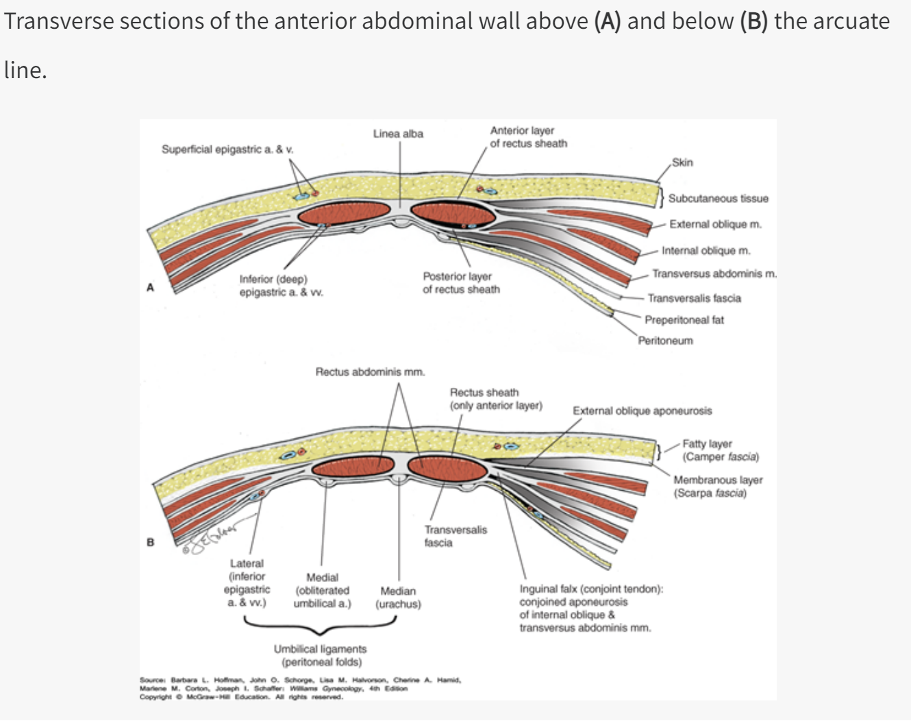 1/3 the distane between the umbi and pubis. Gradual transition zone where fibers of the posterior rectus sheath disappear to form only the anterior sheath