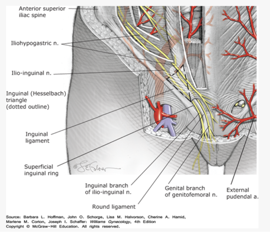 round ligament (ends as labium majus), genital branch of genitofemoral nerve and ilioinguinal nerve