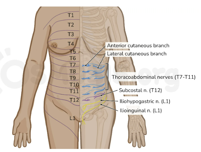 Via the abdominal extensions of the intercostal nerves (T7-T11), the subcostal nerve (T12) : these nerves traverse between the internal oblique muscle and transversus abdominis muscles. ‘Transversus abdominis plane - essential for TAP blocks’.