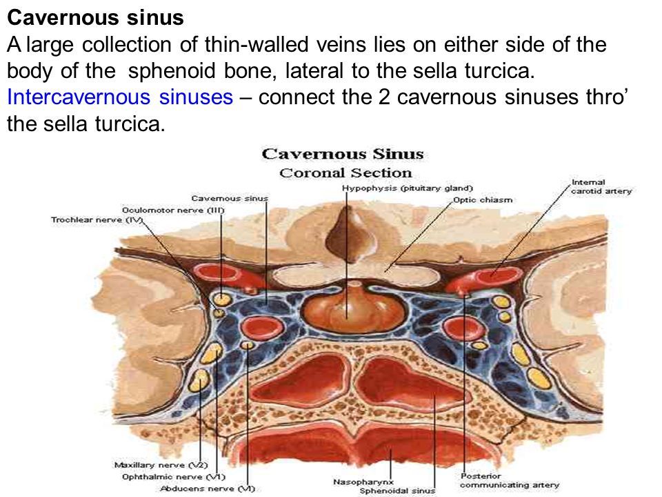 The cavernous sinuses sit immediately lateral to the pituitary gland on either side, while the intercavernous sinuses sit immediately anteriorly and posteriorly