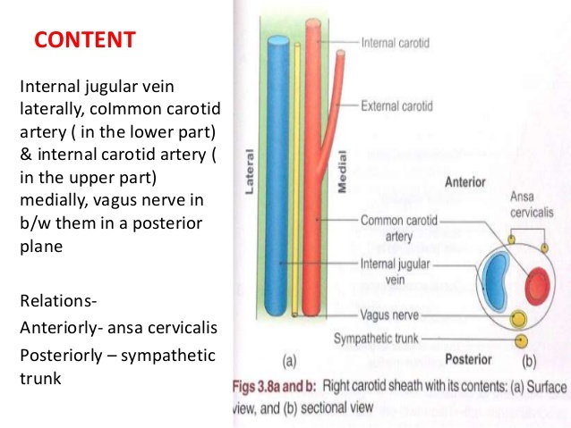Carotid arteries (external passes out, just leaving the internal carotid within the sheath)