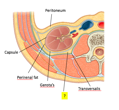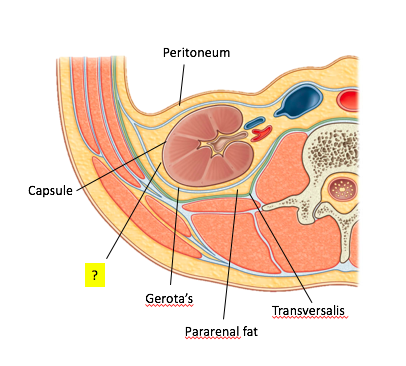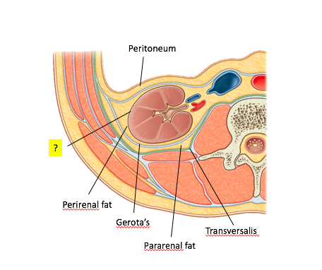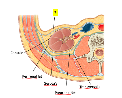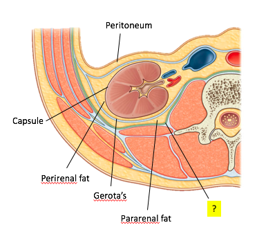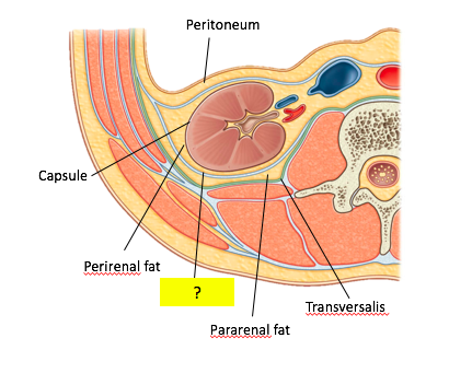 Perirenal (Perinephric) fat: extraperitoneal fat, Outside renal capsule surrounding the kidneys