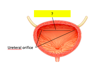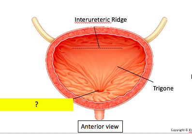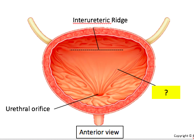 Trigone: Area forming the floor of the bladder, mucosa is firmly attached to muscle wall