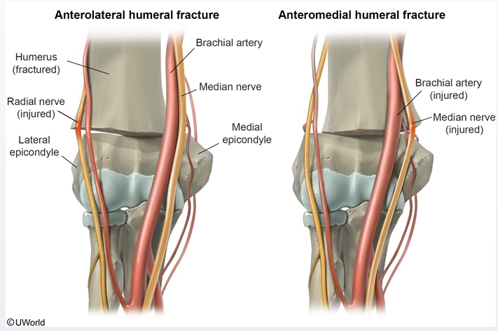 Which structures are affected in a supracondylar humeral fracture with anteromedial displacement vs. anterolateral displacement?