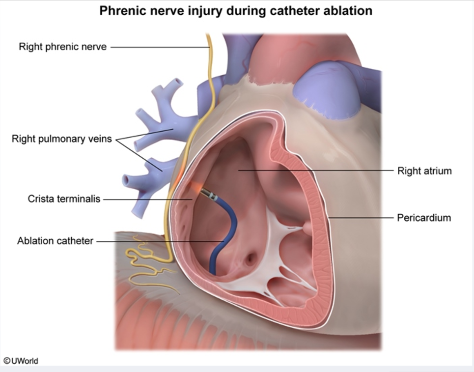Which nerve is at risk for injury during catheter ablation of the right atrium near the crista terminalis, cavotricuspid isthmus, or right-sided pulmonary veins?