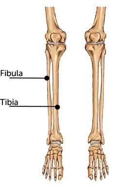 The Tibia is the medial shin bone with ends in the medial malleolus (ankle bone). It is much thicker than the Fibula.