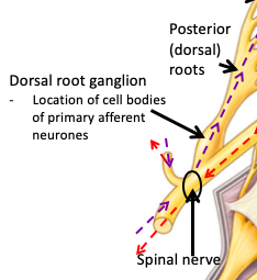 what is the name given to the swelling on the posterior (or dorsal) root and what does it contain?
