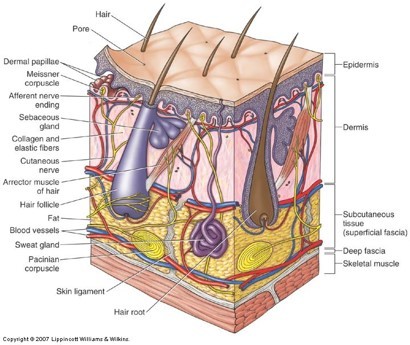 Skin protects the body and underlying tissues, prevents dehydration, participates in thermoregulation, is involved in sensation, and synthesizes/stores vitamin D