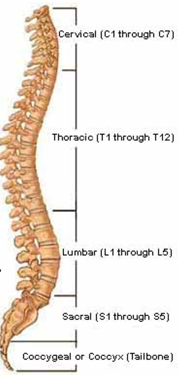Label the 5 regions of the spine, and the number of vertebrae within them