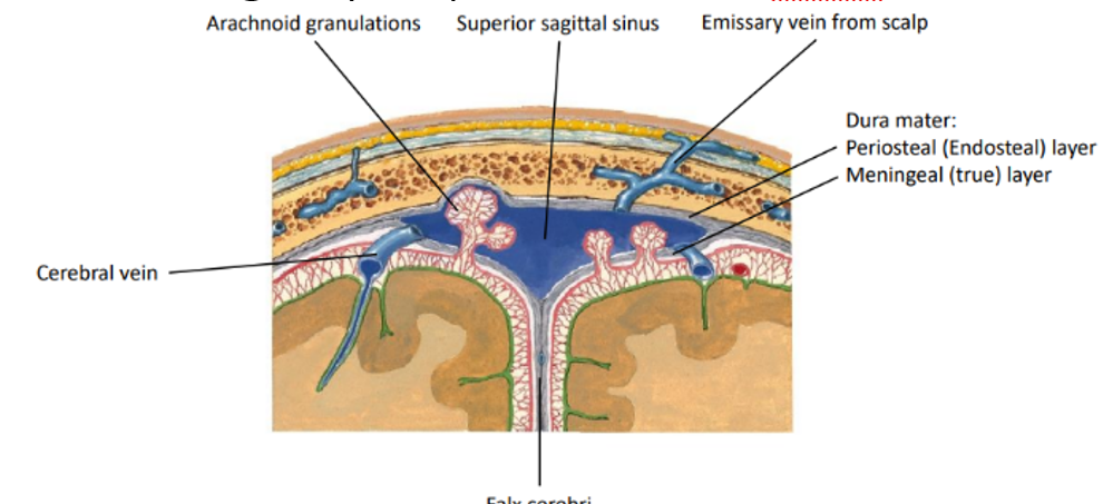 The gap between the layers is called the dural venous sinus - which receives blood from the brain, skull, and scalp.