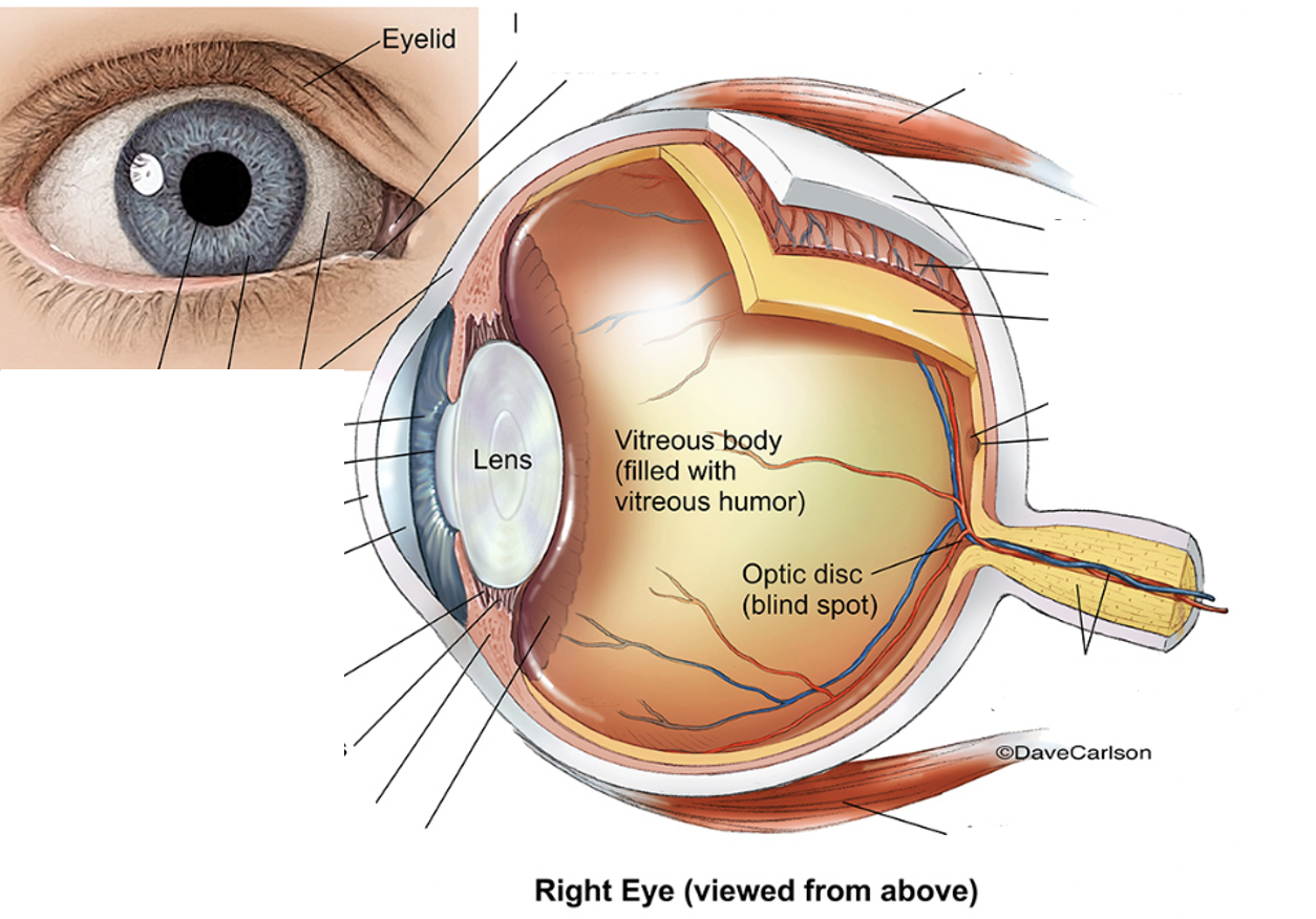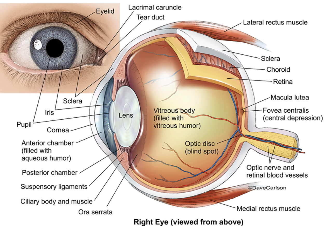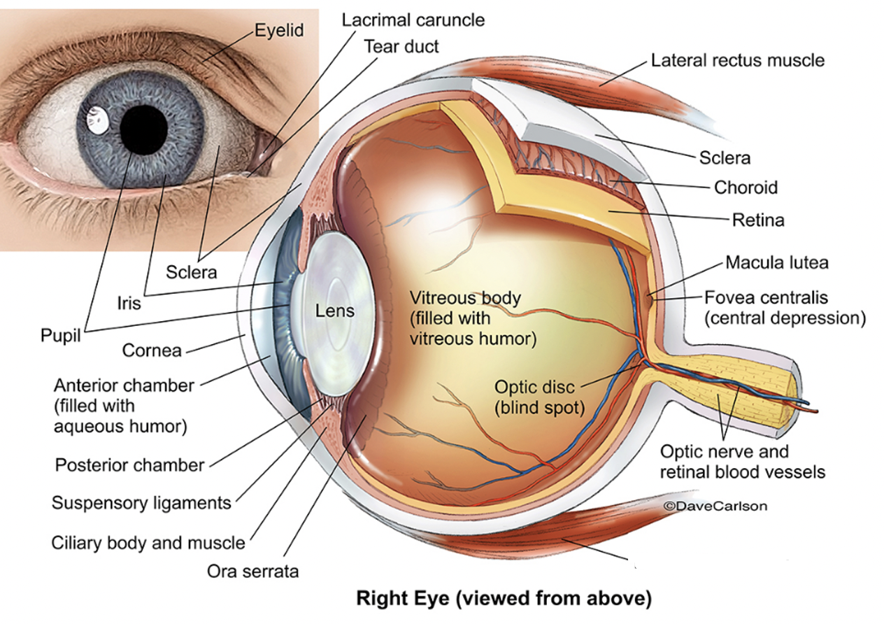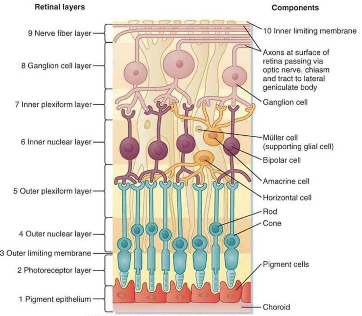 retina: contains retinal pigment epithelium and photoreceptors. Photoreceptors carry impulses via the nerve ganglion–>optic nerve–>brain.