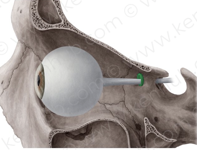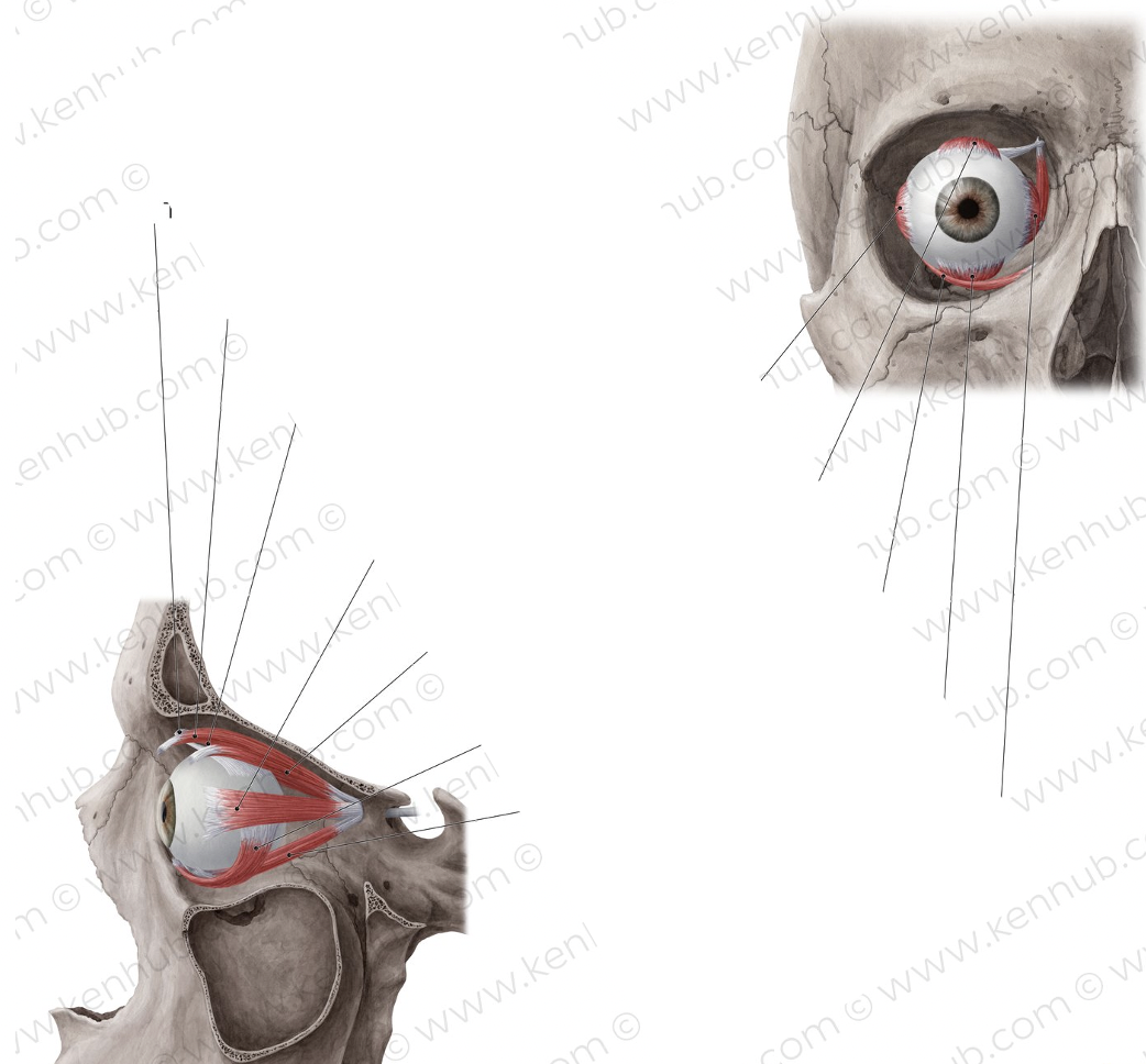 The extraocular muscles originate from the annulus of zinn (in green) except for the inf + sup. oblique.