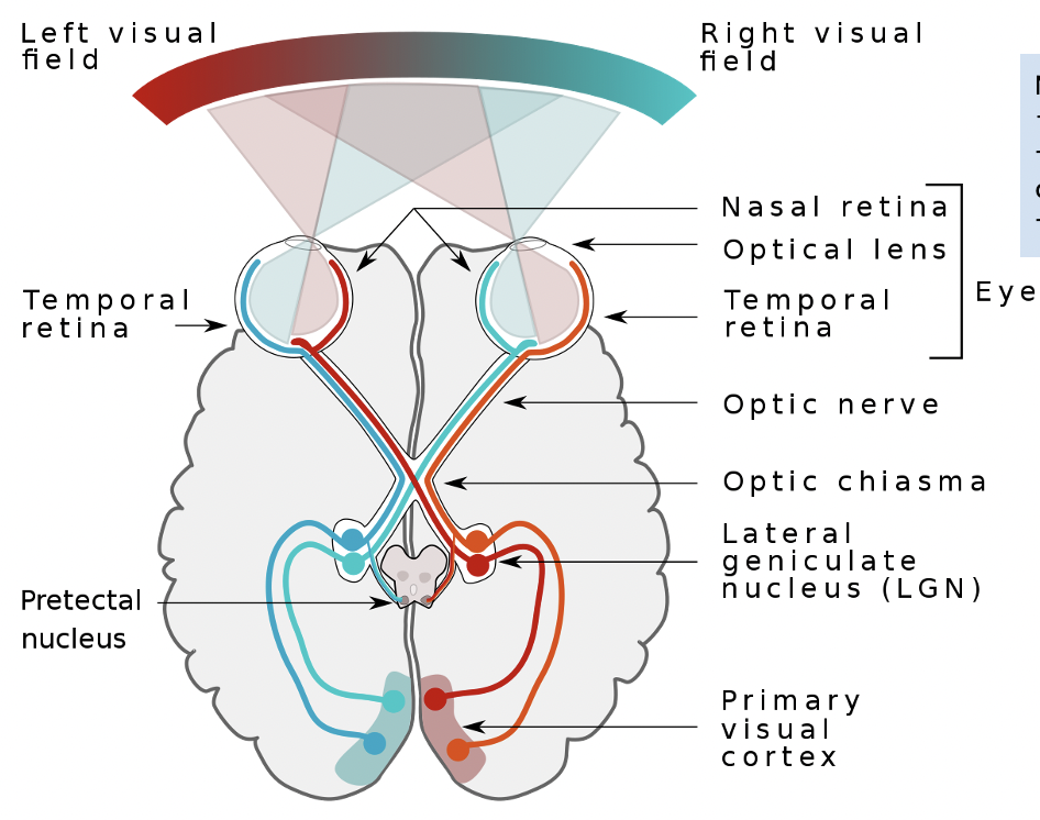 The nasal fibers then cross at the optic chiasm, temporal fibres remain on the same side.