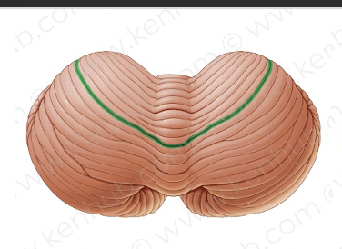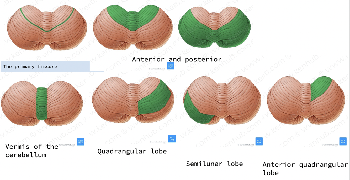 Describe the anatomy of the cerebellum, using this posterior diagram to distingish between the different lobes