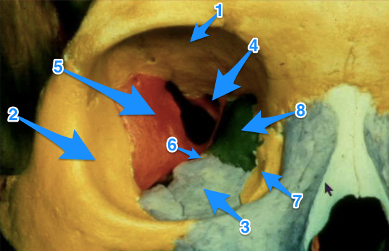 Frontal (1), zygomatic (2), maxillary (3), lesser wing of sphenoid (4), greater wing of sphenoid (5), palatine bone (6), lacrimal bone (7), Orbital plate of ethmoid bone (8)