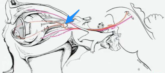 That is the ciliary parasympathetic ganglion. Note how fibers course w/CN III to form the ganglion. These fibers innervate the sphincter pupillae (constricts pupil) and ciliary muscles (used to change lens shape)