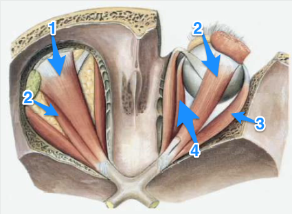 1) Levator Palpebrae Superioris = CN III (superior division) 2) Superior Rectus = CN III (superior division) 3) Lateral rectus (CN VI) 4) Medial rectus = CN III (inferior division)
