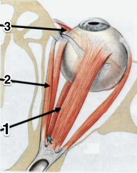 1) Inferior rectus = CN III (lower division) 2) Superior Oblique = CN IV 3) Inferior Oblique = CN IV