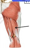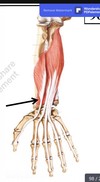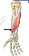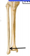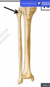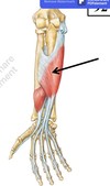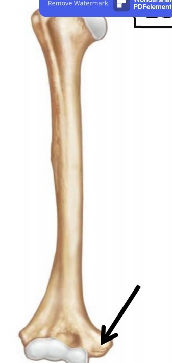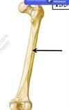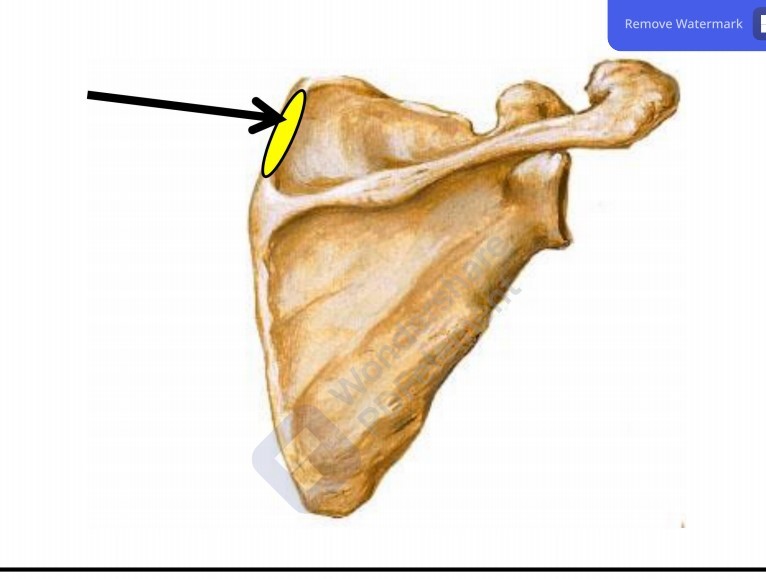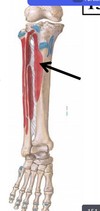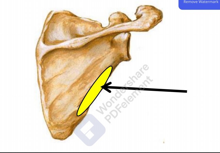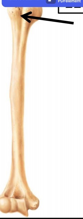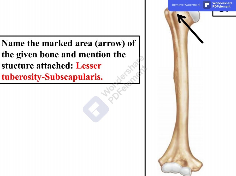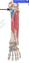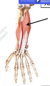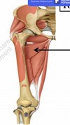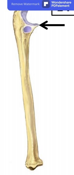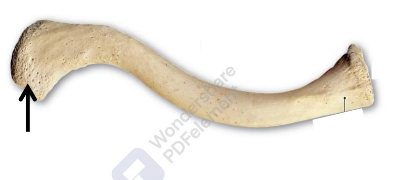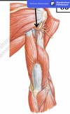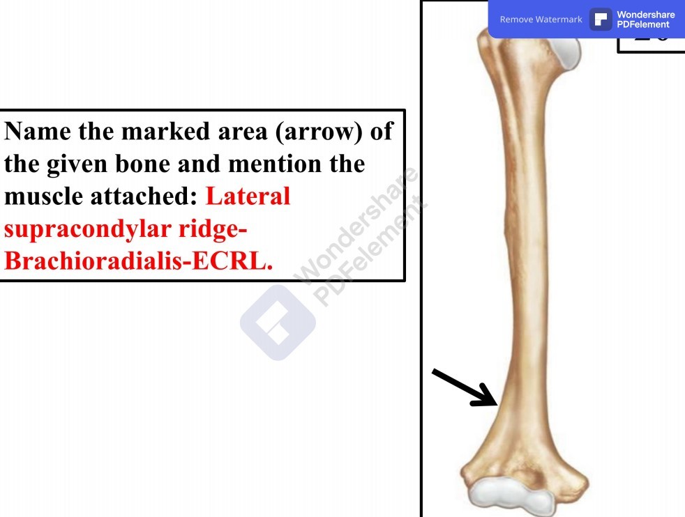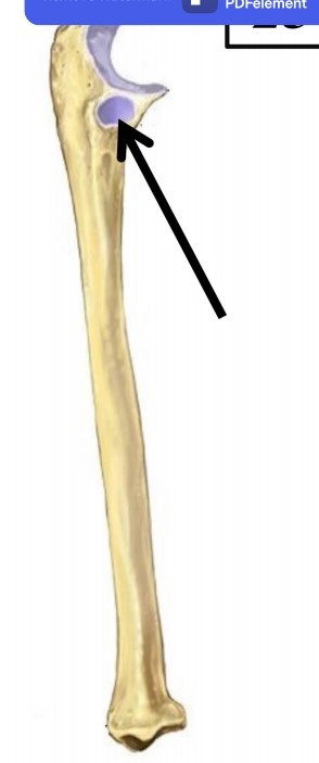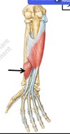 Name the muscle attached to the marked area (arrow) of the given bone and mention one action: