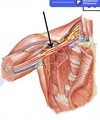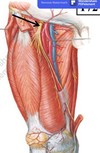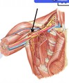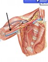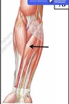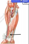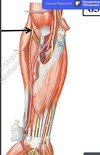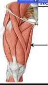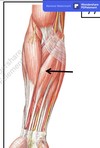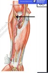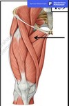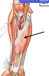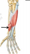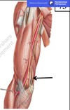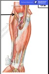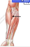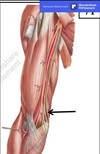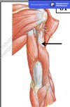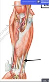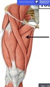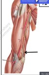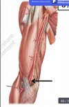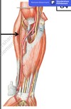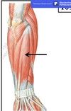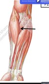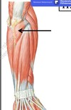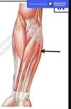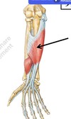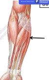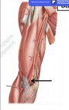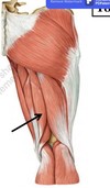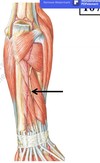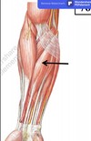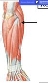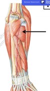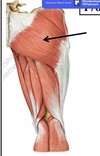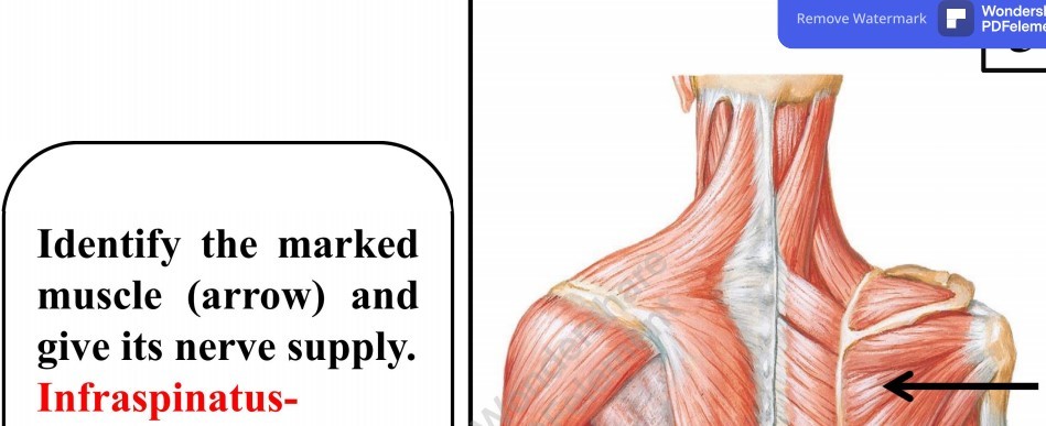 Name the muscle attached to the marked area (arrow) and give its nerve supply.