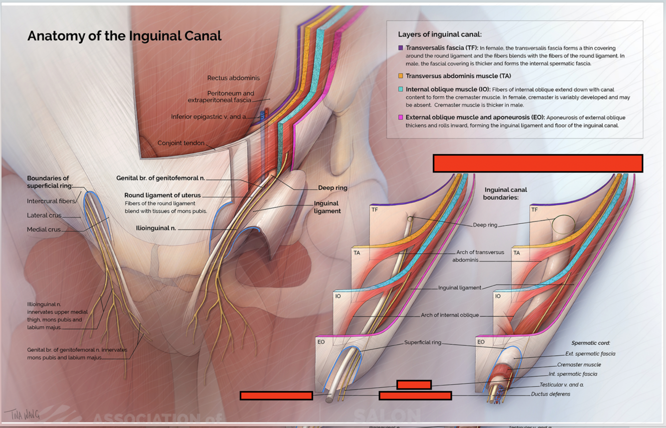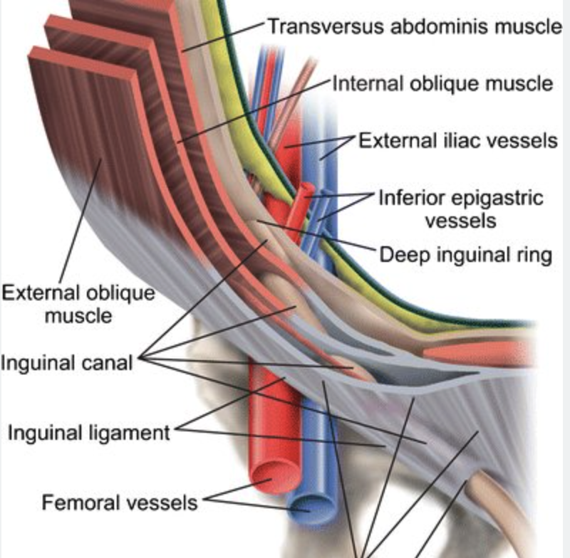 -Extends from deep inguinal ring (aperature in transversalis fascia) to superficial inguinal ring (aperature in the external oblique aponeurosis)
