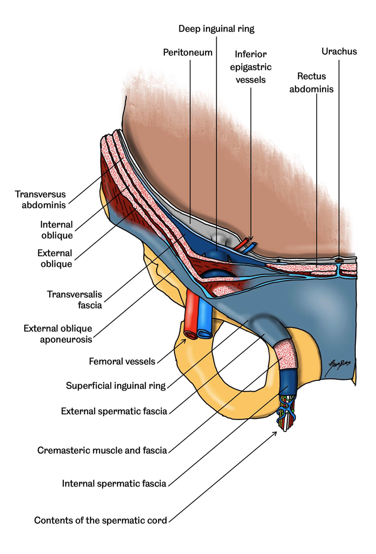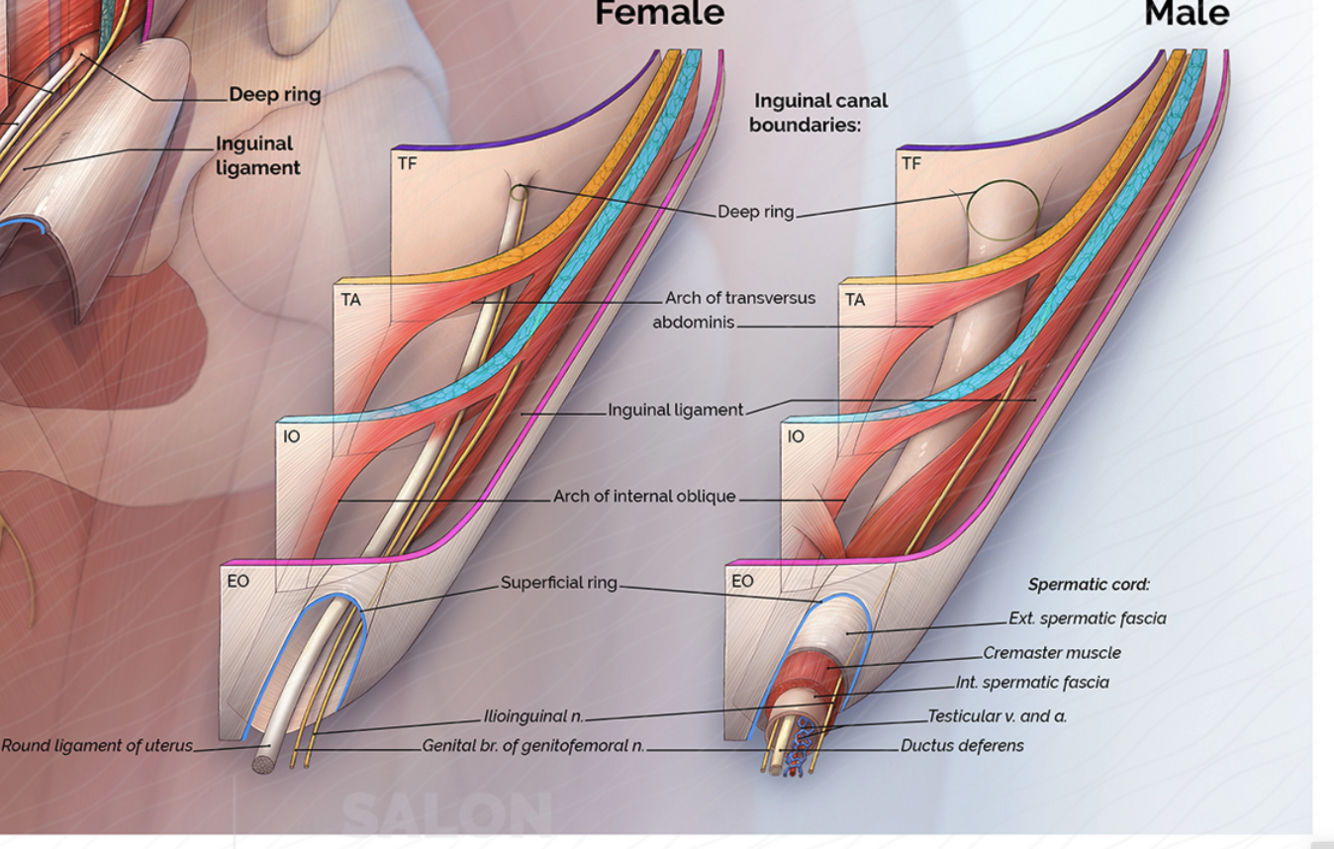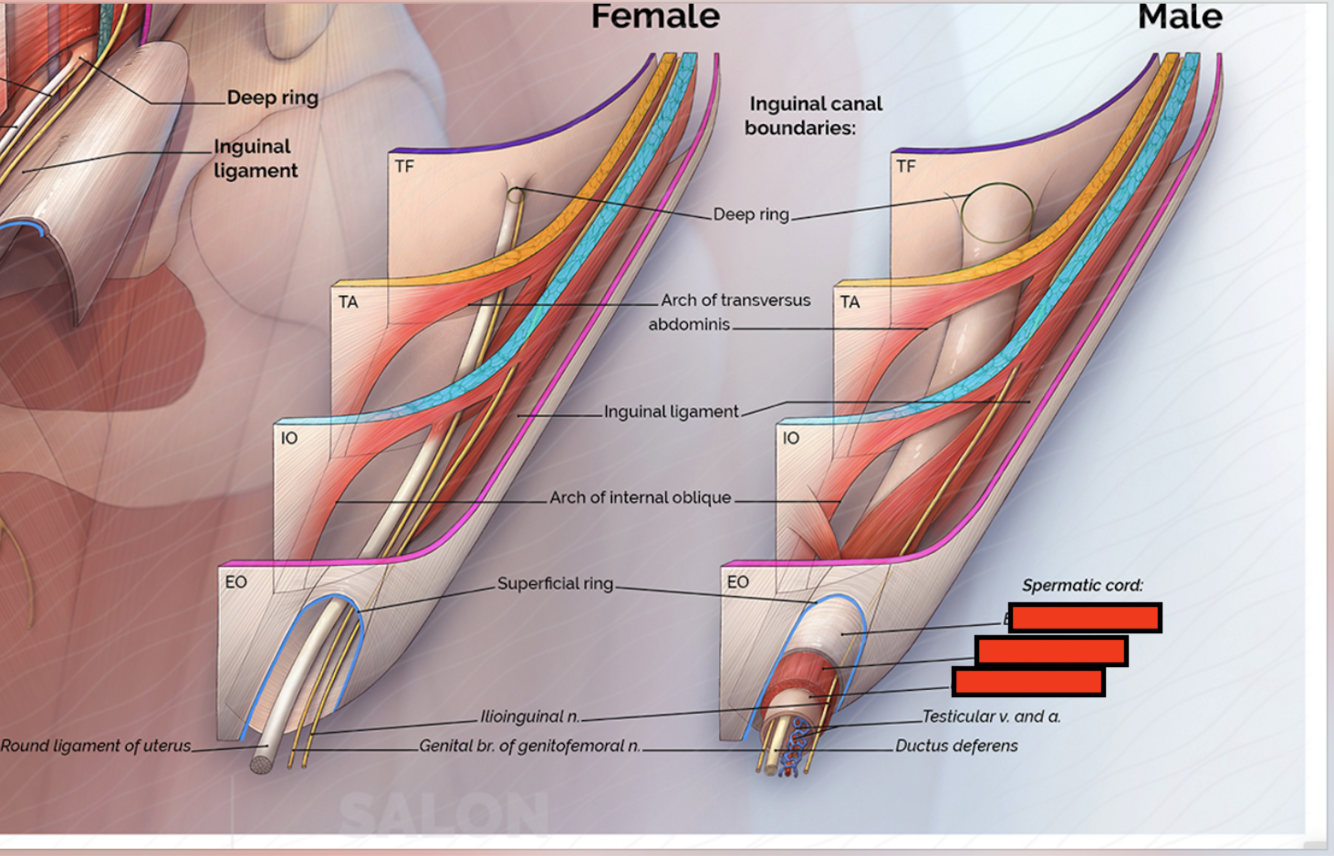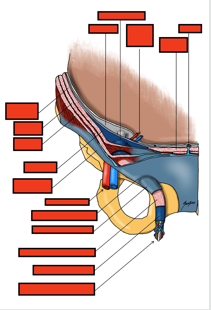 -Through each layer of the abdominal wall as it travels medially and inferiorly