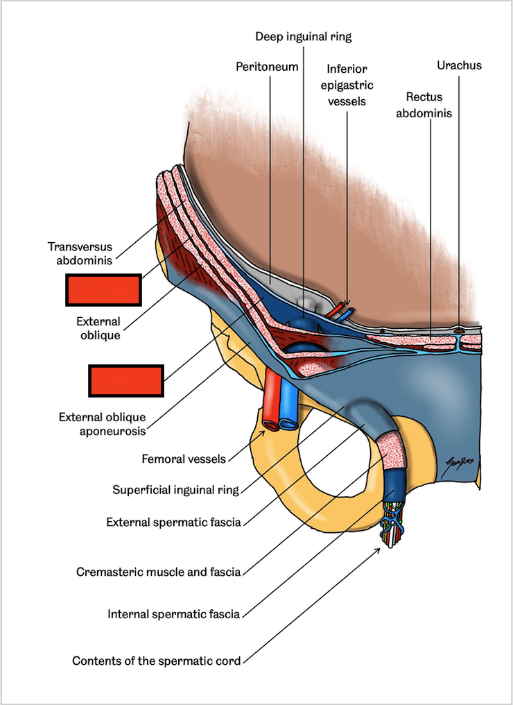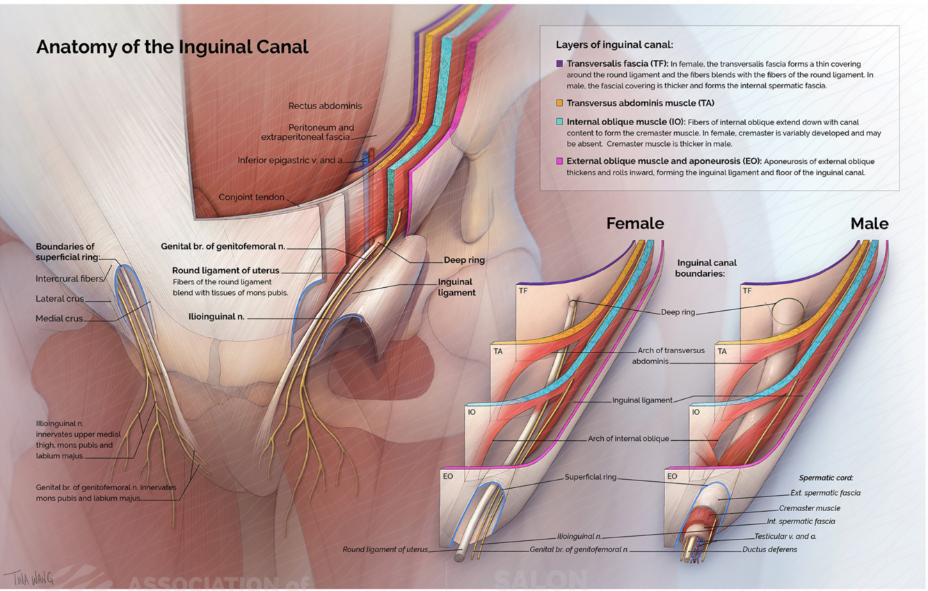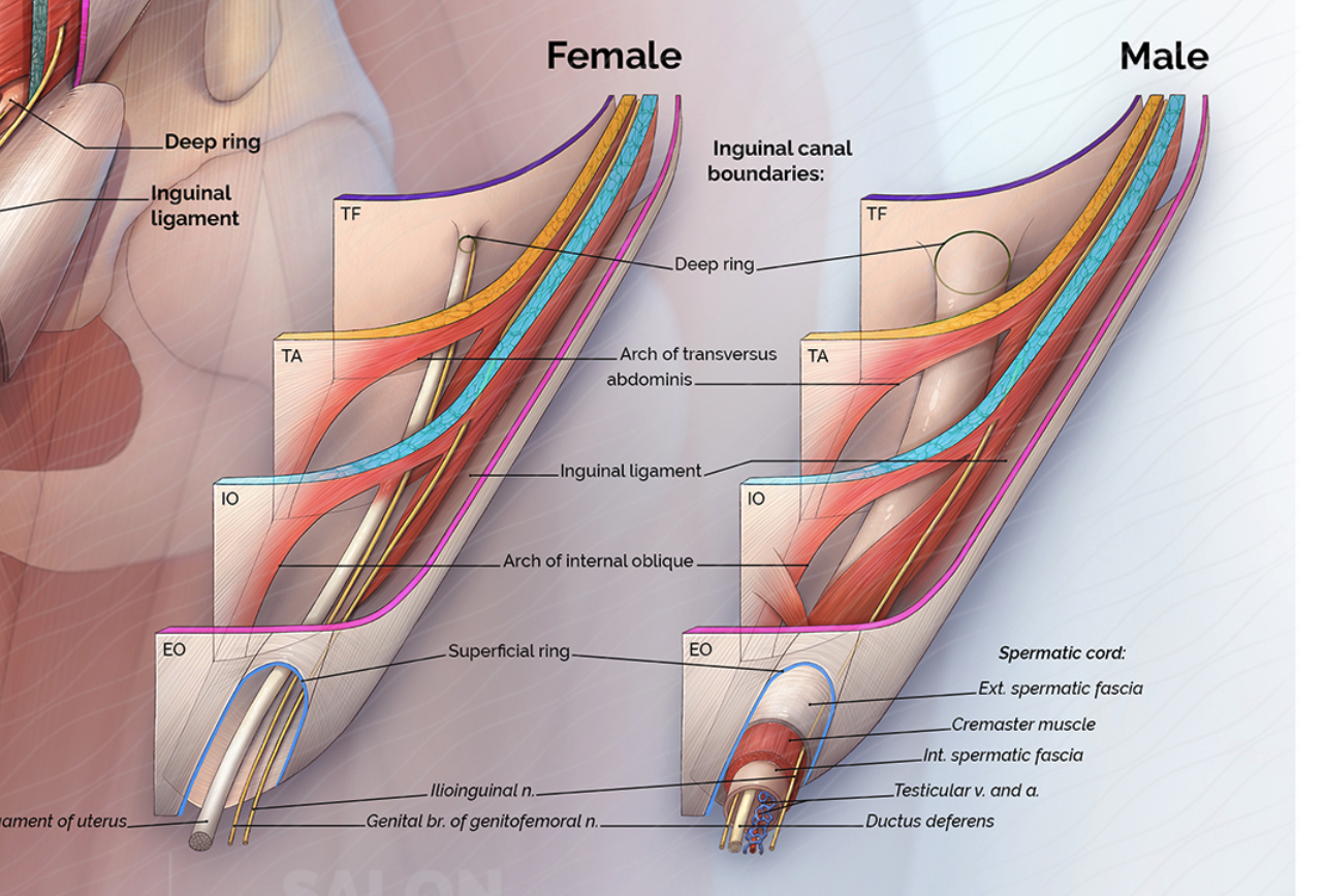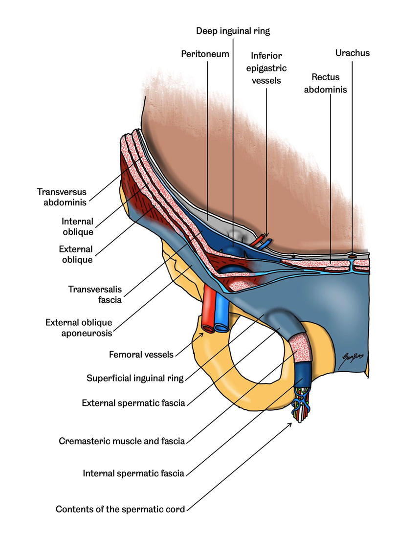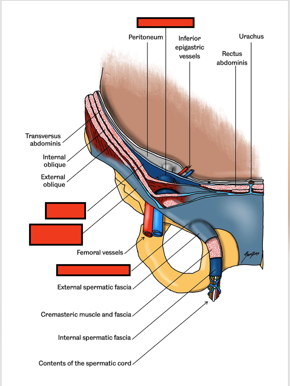 -Through each layer of the abdominal wall as it travels medially and inferiorly