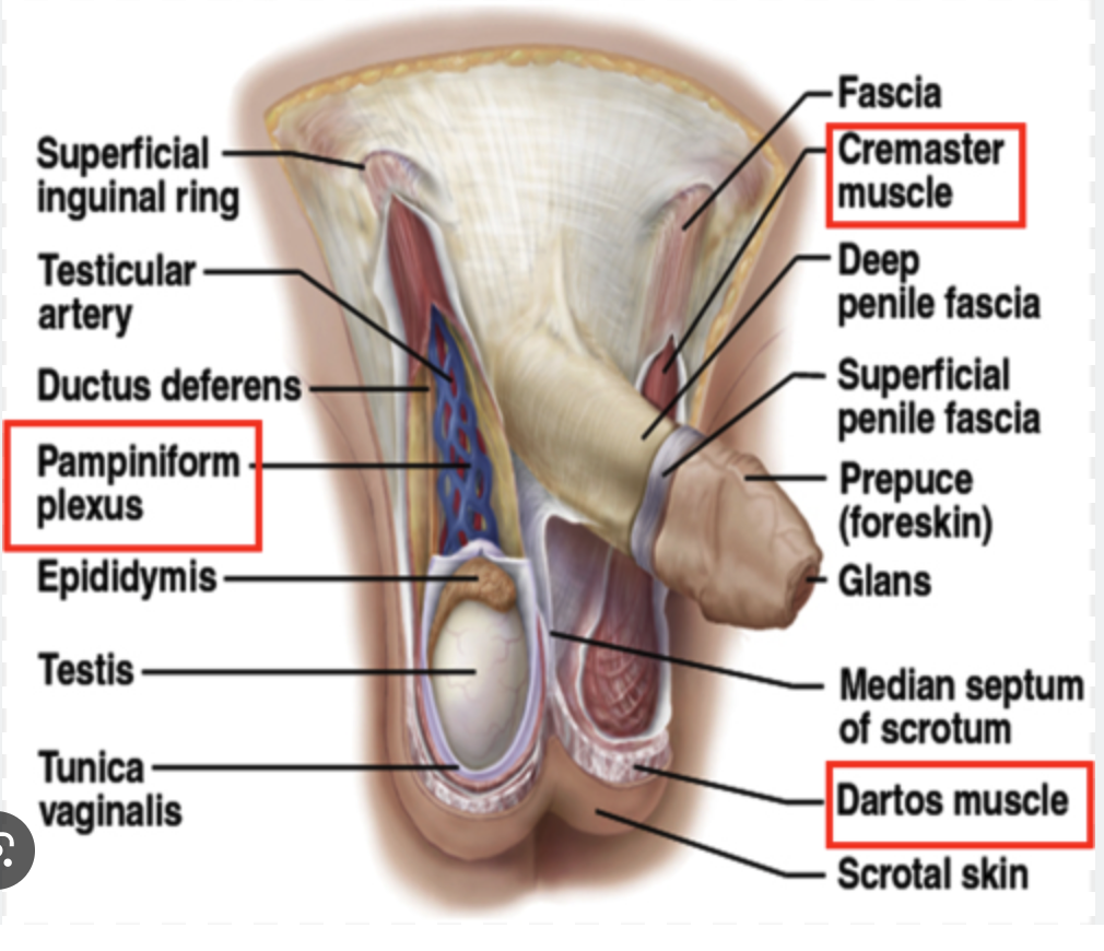 -Beneath is a thin layer of superficial fascia and a thin, involuntary muscle called the dartos