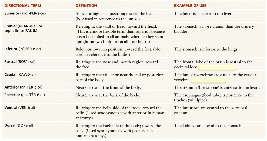 palmar, plantar, anterior/ventral, posterior/dorsal, rostral and caudal.